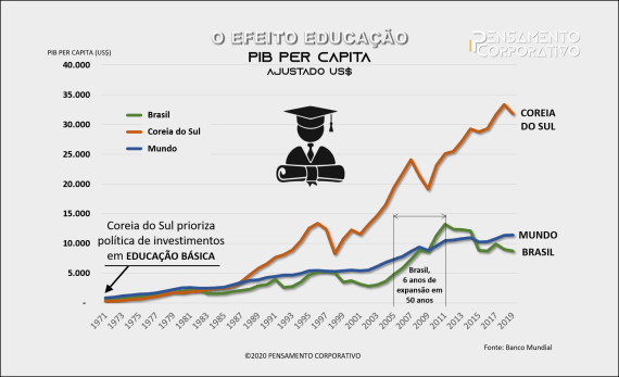 Os sul-coreanos erradicaram o analfabetismo e colocaram mais de 85% dos jovens na universidade. Já o Brasil mantém 7% da população na escuridão do analfabetismo. O PIB per capita da Coréia do Sul há apenas 20 anos era US$ 12.200, enquanto o do Brasil não chegava a US$ 4.000. No ano passado (2019) os valores alcançaram, respectivamente, US$ 32.000 e US$ 8,800, mantendo a proporção de 4:1 em favor do país asiático. Fonte: Banco Mundial.